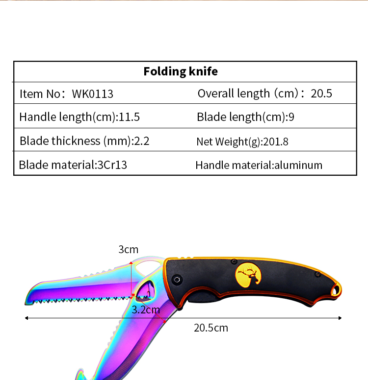 | Item | WK0113 Colorful Aluminium Handle Folding Knife |