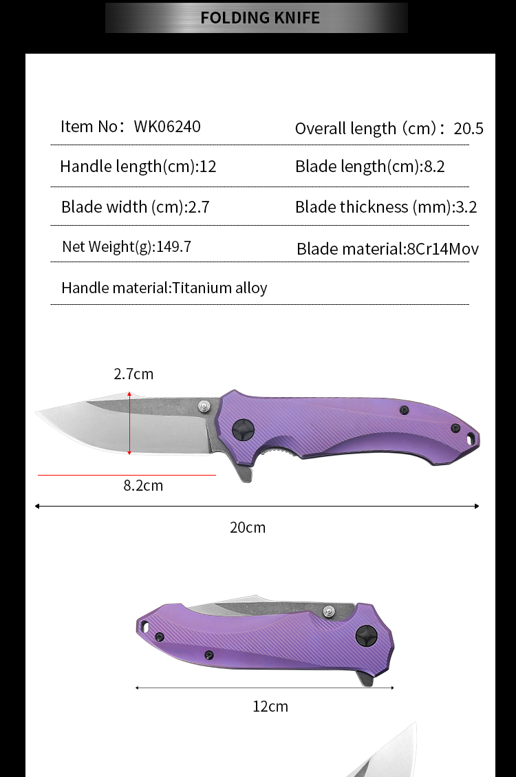 | Item | WK06240 Purple Titanium Alloy Survival Pocket Camping Knife |