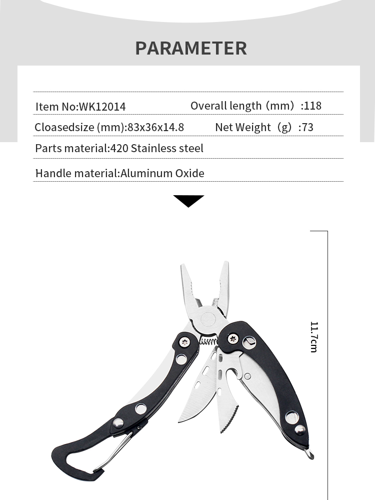 | Item | WK12014 Black Small Fishing Aluminum Oxide Multitool Plier |