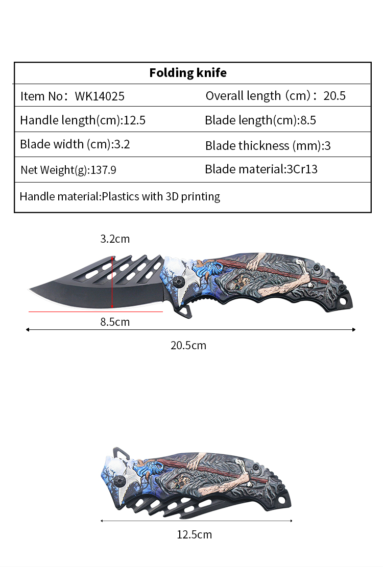 | Item | WK14025 Plastic Pocket Hunting Folding Knife with 3D printing |
