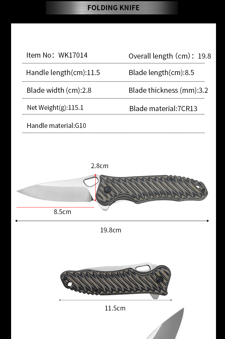 | Item | WK17014 Special Design G10 Folding Climb Knife |