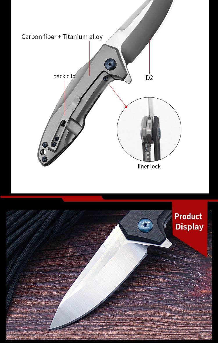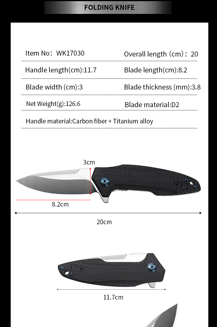 | Item | WK17030 D2 Blade Carbon fiber Titanium alloy Pocket Outdoor Survival Knife |